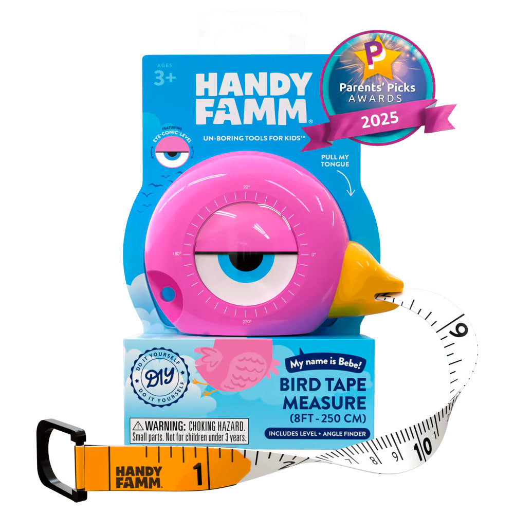 The Handy Famm 3-in-1 STEM Starter Tool featuring Bebe the Pink Bird introduces core measuring and building concepts through hands-on learning. Designed for small hands, it helps kids explore STEM skills at home or in the classroom while using real, functional tools. Built from durable, non-toxic materials and designed for ages 3 and up, it’s a fun and safe way to measure the world around you.