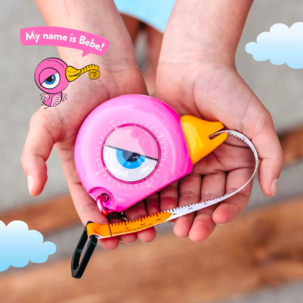 - Tape Measure: Pull the tape from Bebe’s beak to measure up to 8 feet. Press the button on the back to retract smoothly